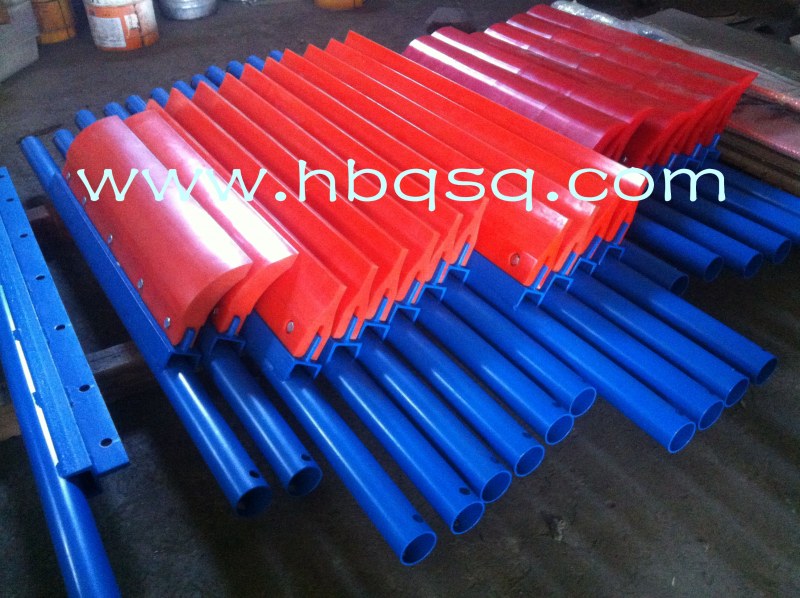 二道清掃器安裝在頭輪下部回移皮帶平直工作面處。P型清掃高分子聚氨酯器適用于清掃回移帶工作面上粘附的物料,屬于二道清掃器。